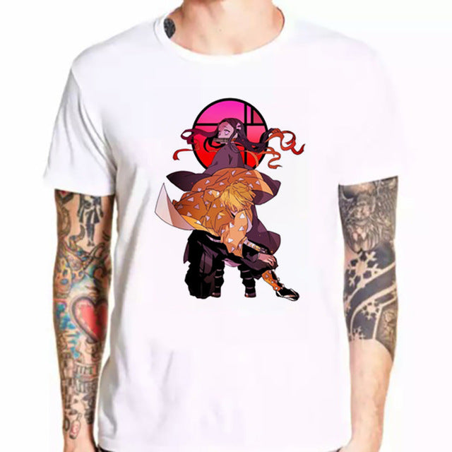 Anime Kimetsu No Yaiba White Cartoon Print T-shirt Male Hip Hop Oversize Top Harajuku Demon Slayer Unisex T Shirt Men Tee Tshirt